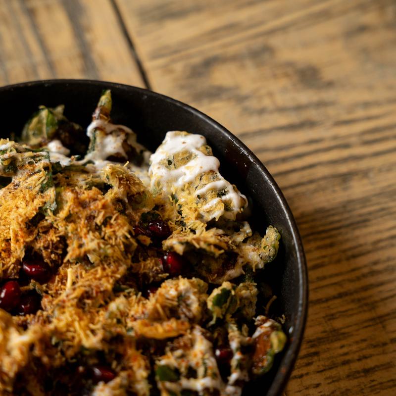 Golden-crisp potato patties stuffed with gulkand and nuts, topped with chilled yogurt, sev, mint, and tamarind chutneys.